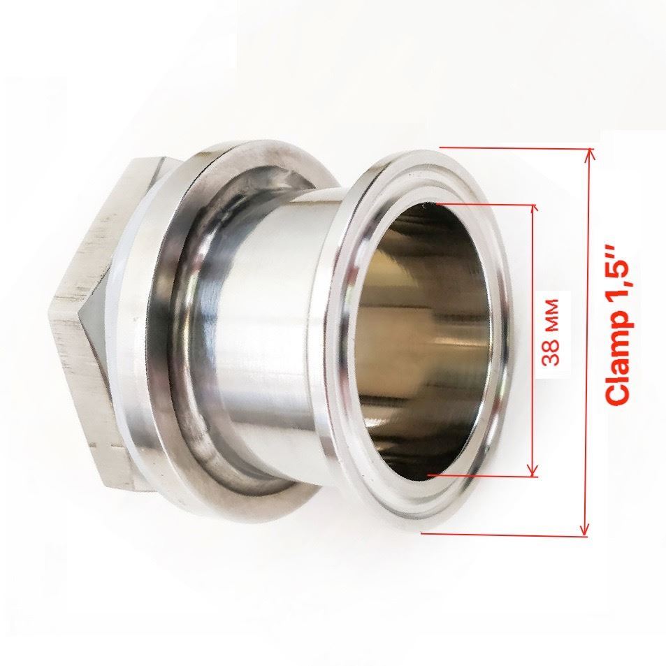 Врезка в перегонный куб Clamp 1,5 дюйма - универсальный и удобный переходник с резьбы 1 дюйм на Clamp 1,5 дюйма, имеет широкое применение в самогонной отрасли - благодаря установки в перегонный куб данной врезки Вы сможете сделать выход под Clamp 1,5 дюйма в Вашем перегонном кубе, а этот выход Вы уже можете использовать как для установки ТЭНа с установочным отверстием Clamp 1,5 дюйма, так и организовать установку дистиллятора с кламповым Clamp 1,5 дюйма. Достаточно будет рассверлить отверстие перегонного куба диаметром 40 мм, и уже в это отверстие вкрутить врезку в перегонный куб Clamp 1,5 дюйма.