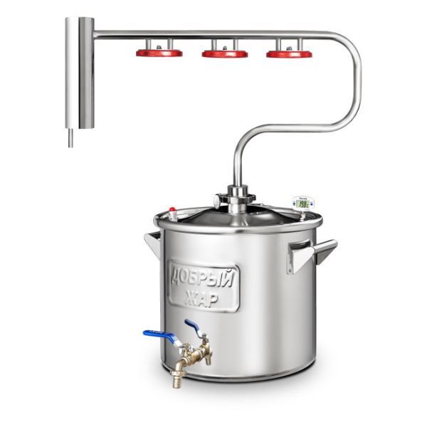 Три сухопарника – это три степени очистки, а также дополнительная ароматизация напитка прямо во время перегонки. В качестве сухопарника можно установить стеклянную банку любого размера и поместить в нее любимые травы и специи. Система охлаждения представлена классическим холодильником со змеевиком, производительность аппарата до 1,5 л/час.