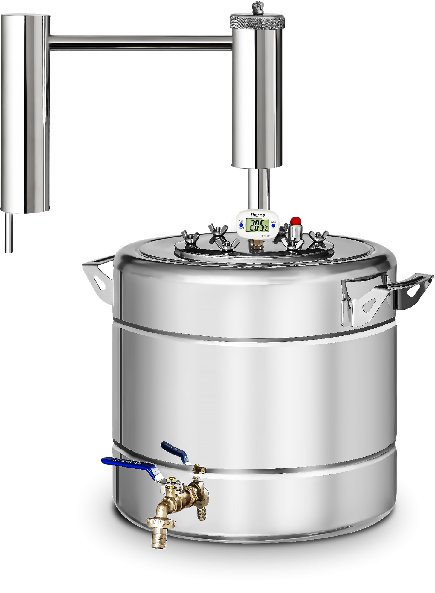 Перегонный куб с фланцевым соединением – это классический вариант перегонного куба. Диаметр горловины 11,5 см – этого достаточно для удобного доступа внутрь аппарата для его очистки после дистилляции. Ребра жесткости не позволяют баку деформироваться при эксплуатации и транспортировке аппарата, что сохранит первоначальный внешний вид изделия в течение долгого времени. Преимущество фланцевого крепления – практичность и удобство сборки. Достаточно установить «голову» аппарата на бак и зафиксировать ее с помощью 6 стальных барашков. За герметичность соединения отвечает прокладка из пищевого силикона. Второе преимущество – демократичная стоимость. Термометр и клапан сброса давления установлены не на перегонном кубе, а на фланце дистиллятора. Если вы решите докупить бак большего или меньшего объема, то это обойдется дешевле.