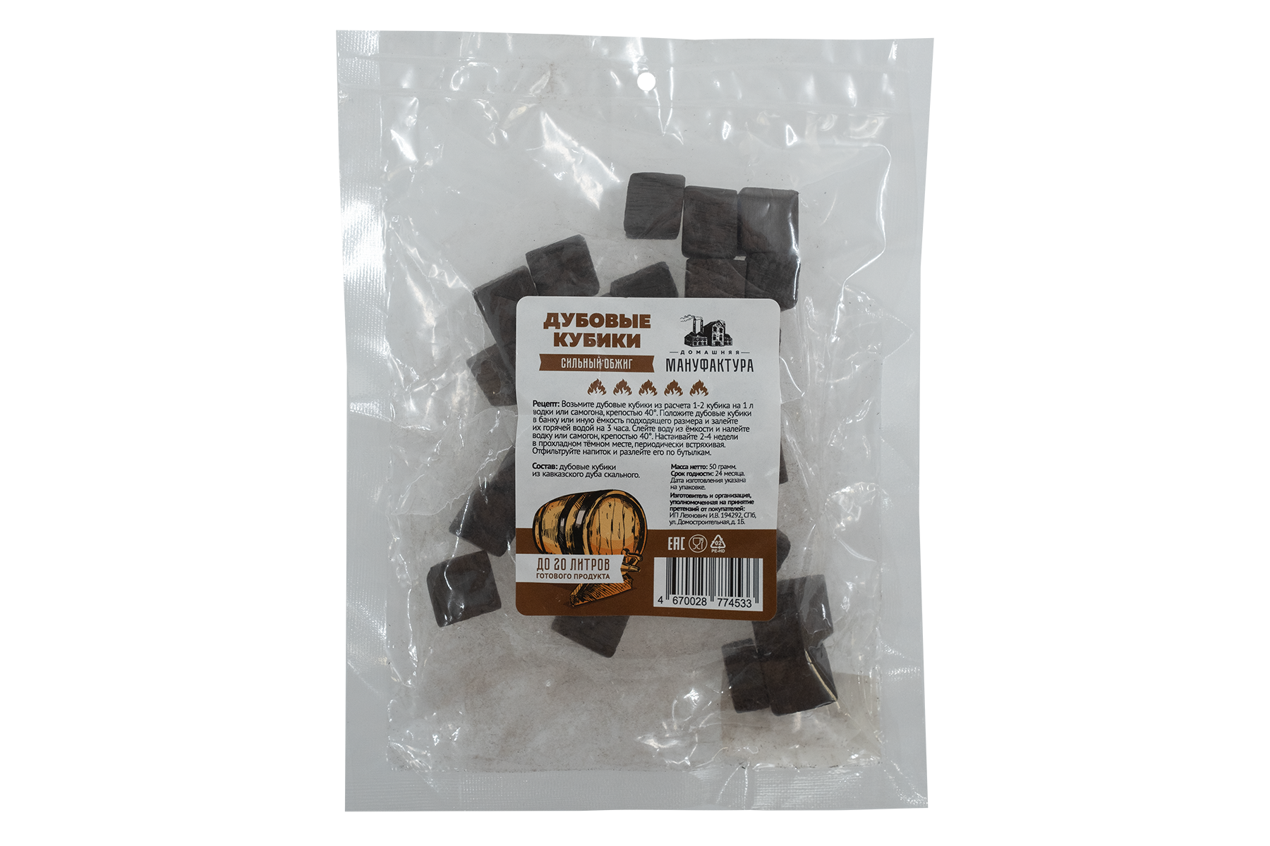 Дубовые кубики сделаны из кавказского дуба отборного качества. Обжарка производится натуральными способами без использования химических процессов, поэтому кубики полностью экологичны и не нанесут вреда здоровью.