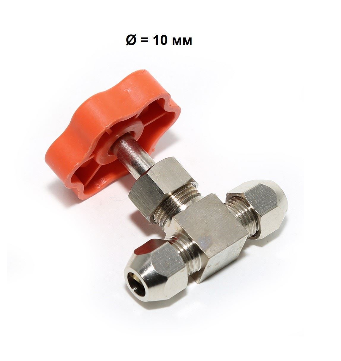 Кран игольчатый латунный диаметром 10 мм – удобный игольчатый кран с цанговыми выходами 10 мм, необходимый для присоединения трубок металлических диаметром 10 мм цанговым методом (обжимание).