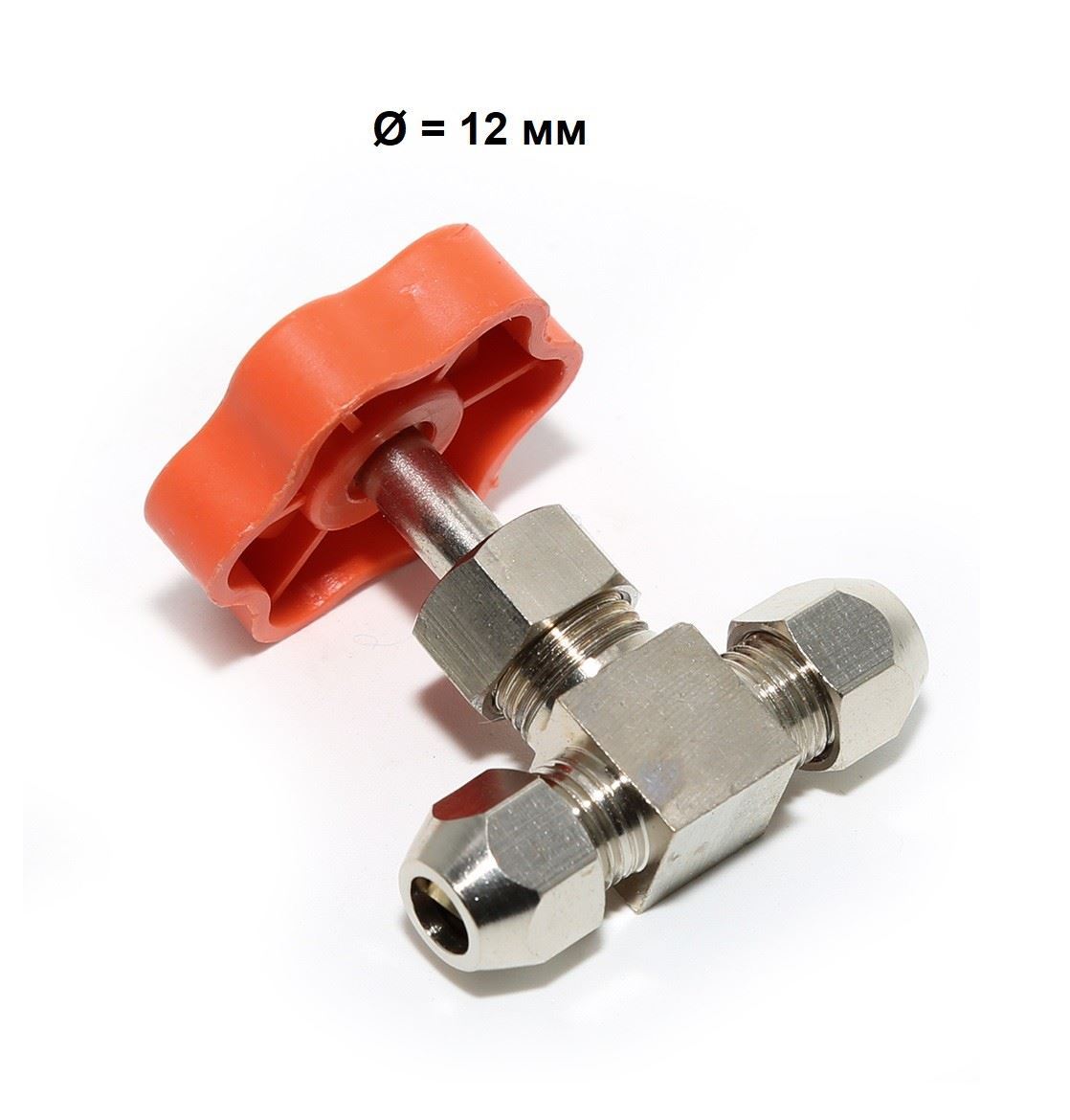 Кран игольчатый латунный диаметром 12 мм – удобный игольчатый кран с цанговыми выходами 12 мм, необходимый для присоединения трубок металлических диаметром 12 мм цанговым методом (обжимание).