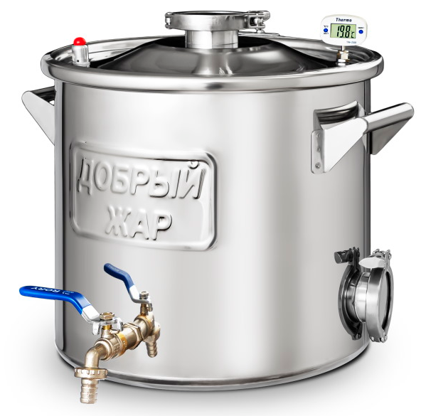 Стенки перегонного куба «Добрый Жар» толщиной 1 мм, дно – 1,5 мм. Такая толщина стали обеспечивает равномерный нагрев жидкости – брага не пригорит, а вкус напитка не будет иметь посторонней горечи.