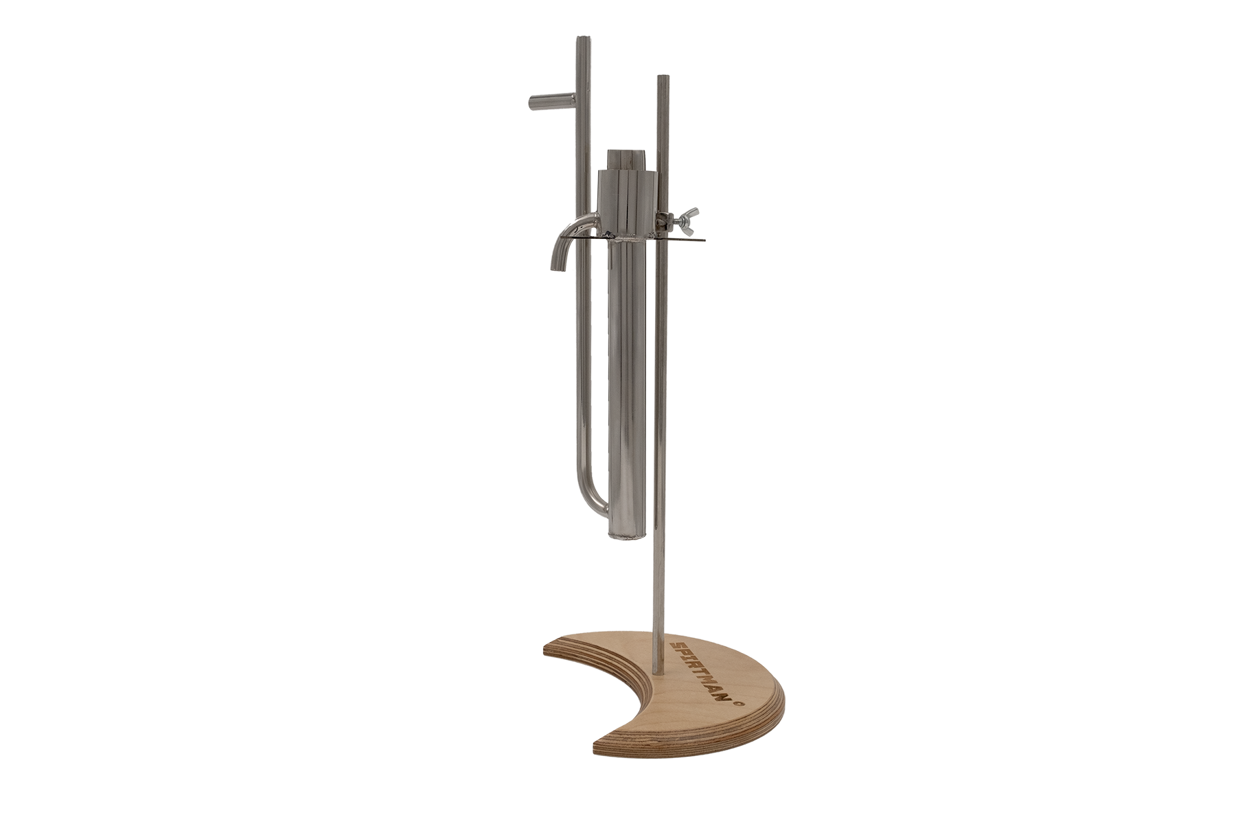 1. Устройство устанавливается на входящий в комплект, штатив высотой 400мм. Штатив имеет удобную и стильную подставку специальной формы. Такая форма позволяет разместить ёмкость для сбора продукта, максимально близко к «Попугаю», при этом обеспечивая идеальную устойчивость. При таком варианте вы можете, передвигая устройство по штативу, подобрать максимально удобную для Вас высоту, а это очень удобно так как носик выхода продукта на всех самогонных аппаратах находится на разной высоте.  Надев на носик выхода продукта, силиконовую трубку нужной длины, вы обеспечите надёжный перелив продукта в любую ёмкость.