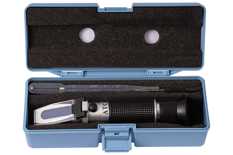 Использовать рефрактометр очень просто. Сначала его нужно откалибровать: помещаете каплю дистиллированной воды на стекло, закрываете крышкой и ждёте 30 секунд. Направляете рефрактометр на источник света и смотрите в окуляр: измерения снимаются с помощью линии раздела синего поля и светлого поля (вы сразу всё поймёте, стоит вам только посмотреть). Эта линия указывает на градус шкалы Брикс, которую вы также видите в окуляре. С помощью калибровочной отвёртки добиваетесь того, чтобы рефрактометр показывал 0 Брикс на дистиллированной воде. После калибровки очищаете стекло, капаете на него суслом и считываете показания.
