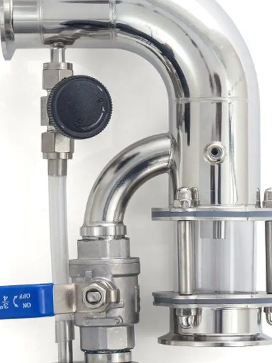 Совмещенный узел отбора по пару и жидкости от самогонного аппарата Wein 6 PRO. Диаметр кламповых отверстий — 2 дюйма. Узел отлично впишется в конструкцию любого аппарата на 2-дюйма с разборной колонной. Главное, что дает узел — решает проблему выбора. Новичку не нужно думать, какой тип отбора выбрать — можно попробовать оба и остановиться на более удобном. А более опытные винокуры смогут их комбинировать во время перегонки: например, «головы» можно отбирать по жидкости, а «тело» — по пару.
