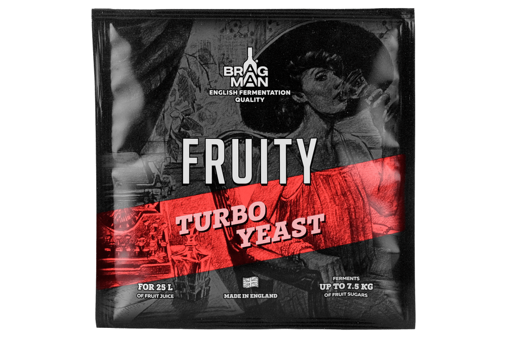 Сухие спиртовые дрожжи Bragman "Fruity Turbo" со смесью питательных веществ, витаминов и микроэлементов.